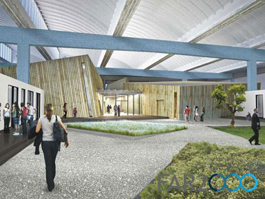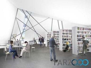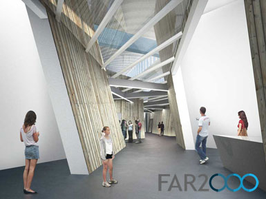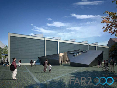 柏林猶太人博物館今天召開記者招待會,公布了由丹尼爾·里貝斯金德設計的博物館學院(Jewish Museum Berlin Academy)。博物館已經在2001年落成,作為擴建部分的玻璃庭院也在2007年建成。學院則位于原柏林花卉市場,并利用現有的交易大廳做設計。 學院將把圖書館、檔案館、教育和公共項目結合在一起,并為博物館提供了更多辦公空間、儲藏室和支持空間等。里貝斯金德設計的新入口在保留原交易大廳的同時為未來的擴建打下了基礎。 學院建筑是一座傾斜的立方體,與博物館的“流亡花園”和玻璃庭院有著相似的主題。天窗做成希伯來文字“Alef”和“Bet”的形狀,外墻用鈦鋅板包面。進入大廳后,游客可看到兩座立方體,分別是演講廳和圖書館,并以木板包面,很像是大船上的貨柜。其他的空間如同細胞一樣聚集在一起,位于一層和地下室。