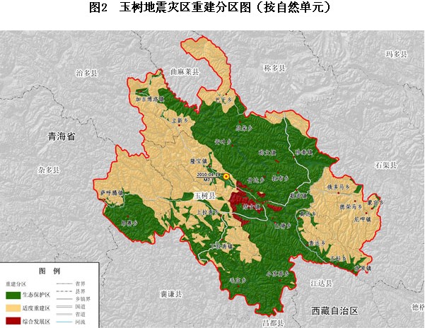 第三章 重建分區和城鄉布局 根據資源環境承載能力綜合評價,城鎮及農村居民點的重建選址原則為就地重建、局部避讓、積極設防、科學規劃。加強基礎設施和公共服務能力建設,適當吸納三江源自然保護區核心區、緩沖區生態移民以及分散居住的人口向生態環境容量和就業容量相對較大的城鎮集中。 第一節 重建分區 災后恢復重建要與三江源、隆寶自然保護區規劃相銜接,根據資源環境承載能力綜合評價,將規劃區國土空間劃分為生態保護區、適度重建區和綜合發展區。 生態保護區。主要指三江源、隆寶自然保護區的核心區、緩沖區和實驗區,以及畜牧業適宜發展區。加強對生態功能退化的草地、林地和濕地的保護,控制人為因素對自然生態的干擾破壞,增強水源涵養、水土保持、生物多樣性維護等生態系統功能。 適度重建區。主要指集中分布在玉樹西北部和東部的農牧業適度發展區和人口相對集中區。對該區域內的鄉鎮實行就地重建,穩定人口規模,控制農牧業開發和鄉鎮建設強度。逐步恢復生態系統功能,重點實施退牧還草、退化草地治理、濕地與野生動物保護等工程,適度發展生態旅游等特色產業。 綜合發展區。主要指27個鄉鎮駐地。以鄉鎮政府所在地為重點,適當集聚人口。在保護生態環境的同時,適度擴大用地規模,完善鄉鎮公共服務功能,拓寬就業渠道,發展農畜產品加工、生態旅游和特色產業,吸納生態保護區人口轉移。