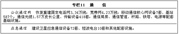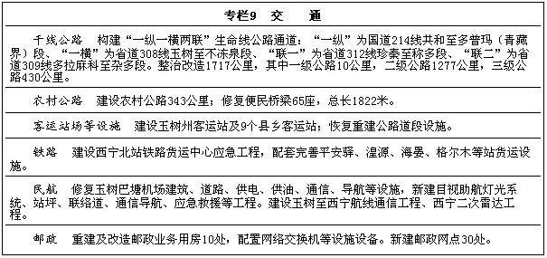 第六章 基礎(chǔ)設(shè)施 基礎(chǔ)設(shè)施的恢復(fù)重建,既要加快災(zāi)區(qū)受損設(shè)施的功能恢復(fù),又要充分考慮恢復(fù)重建的能力保障需求,根據(jù)災(zāi)區(qū)地質(zhì)地理?xiàng)l件和城鄉(xiāng)建設(shè)規(guī)劃,調(diào)整布局,優(yōu)化結(jié)構(gòu),合理確定建設(shè)標(biāo)準(zhǔn),統(tǒng)籌各類設(shè)施建設(shè),推進(jìn)共建共享,充分發(fā)揮基礎(chǔ)設(shè)施對(duì)經(jīng)濟(jì)社會(huì)發(fā)展的支撐作用和安全保障能力。 第一節(jié) 交 通 公路。加快干線公路恢復(fù)重建,提高國(guó)省干線公路技術(shù)等級(jí)和抗災(zāi)能力,構(gòu)建“一縱一橫兩聯(lián)”生命線公路通道,建設(shè)通縣二級(jí)公路,提高西寧至玉樹公路建設(shè)等級(jí)和保通能力。全面修復(fù)農(nóng)村公路災(zāi)損路段,恢復(fù)建設(shè)便民橋梁,努力提高通達(dá)、通暢水平。修復(fù)重建客貨運(yùn)站場(chǎng)等設(shè)施。 民航。盡快修復(fù)玉樹巴塘機(jī)場(chǎng)受損設(shè)施設(shè)備,建設(shè)目視助航燈光系統(tǒng)及市內(nèi)保障基地等工程,建設(shè)航線通信工程等,提高機(jī)場(chǎng)吞吐能力和航空應(yīng)急救援保障能力。 鐵路。為加強(qiáng)恢復(fù)重建物資運(yùn)輸保障,實(shí)施青藏鐵路相關(guān)站場(chǎng)貨運(yùn)設(shè)施配套完善工程。 郵政。恢復(fù)重建郵政業(yè)務(wù)用房及相關(guān)設(shè)施,完善郵政網(wǎng)點(diǎn),配置相關(guān)設(shè)備,保障和提高郵政服務(wù)能力。