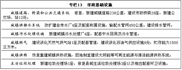 第五節(jié) 市政設(shè)施 結(jié)古鎮(zhèn)。按照結(jié)古鎮(zhèn)總體規(guī)劃,建設(shè)道路及公共交通系統(tǒng)。加強(qiáng)供水、排水等設(shè)施建設(shè),提高建筑節(jié)能標(biāo)準(zhǔn),因地制宜地選擇供熱和采暖方式,推廣利用可再生能源和清潔能源供熱。配套建設(shè)污水、垃圾處理設(shè)施,建設(shè)必要的民用液化石油氣儲(chǔ)配設(shè)施,實(shí)現(xiàn)市政公用設(shè)施全面覆蓋。按照標(biāo)準(zhǔn)設(shè)置緊急避災(zāi)場(chǎng)所和避災(zāi)通道。 其他城鎮(zhèn)。加強(qiáng)城鎮(zhèn)道路改造,加大水源設(shè)施及供排水系統(tǒng)建設(shè)力度,配套建設(shè)污水、垃圾處理及儲(chǔ)配氣站等設(shè)施。支持村鎮(zhèn)垃圾處理和環(huán)衛(wèi)設(shè)施建設(shè)。