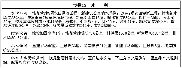 第四節(jié) 水 利 農(nóng)田水利。恢復(fù)重建玉樹、稱多、囊謙三縣農(nóng)牧區(qū)水利灌溉設(shè)施,改造灌區(qū)配套設(shè)施,提高農(nóng)牧業(yè)綜合生產(chǎn)能力。 防洪設(shè)施。建設(shè)結(jié)古鎮(zhèn)防洪工程,加強(qiáng)河道綜合治理,建設(shè)巴塘河和扎西科河堤防、北山排洪渠及溝道防洪工程。加強(qiáng)其他縣鎮(zhèn)防洪工程建設(shè)和重點(diǎn)河流河道整治。 水土保持。加強(qiáng)三江源自然保護(hù)區(qū)水土保持綜合治理,以溝道攔蓄、溝岸防護(hù)、林草恢復(fù)為重點(diǎn),加大水源地保護(hù)力度,提高水源涵養(yǎng)能力。 水文及水資源監(jiān)測(cè)。恢復(fù)重建水文、水保設(shè)施,提高水文、水保監(jiān)測(cè)能力。