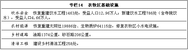 第六節(jié) 農(nóng)牧區(qū)基礎(chǔ)設(shè)施 飲水安全。恢復(fù)重建農(nóng)牧區(qū)飲水安全工程,基本解決玉樹災(zāi)區(qū)農(nóng)牧區(qū)飲水安全問題。 配套設(shè)施。加強(qiáng)恢復(fù)重建村莊及居民點(diǎn)通水、通電、通路及必要的防護(hù)等配套設(shè)施。實(shí)施鄉(xiāng)村清潔工程,有條件的村莊推行垃圾收集、填埋處理。