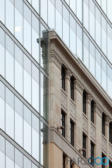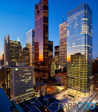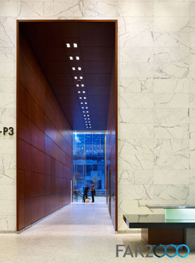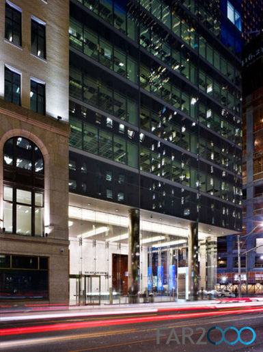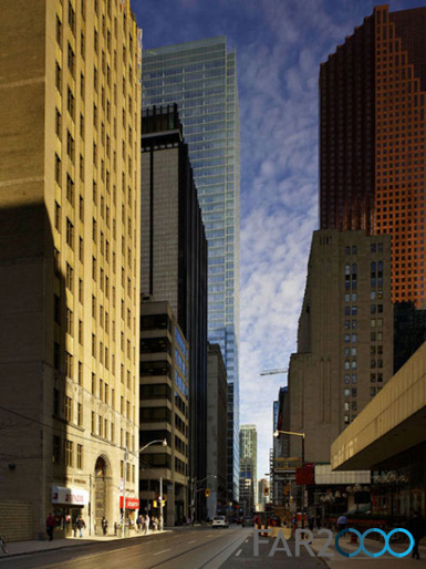建成于今年1月的51層阿德萊德灣中心大廈在尺度上與周圍銀行大樓差不多。它位于多倫多市金融中心占地兩個(gè)街區(qū)的開發(fā)地帶上。 這座大廈有11.1萬平方米的3A級(jí)辦公空間和3700平方米的地下零售空間,并連接著市區(qū)的PATH線路。該建筑是三座大廈組成的項(xiàng)目中的一期工程,三座大廈中間是一座城市廣場(chǎng),面積1/2英畝。 大廈所在的海灣大街(Bay Street)有著很多高大的歷史建筑,被譽(yù)為“海灣大街峽谷”。由Chapman和Oxley為1926年國立大廈重新設(shè)計(jì)的立面也無縫化地結(jié)合在了新建筑上。 主樓大堂是高度透明的,外墻采用經(jīng)典的Stauario大理石和Makore木材。夜晚,點(diǎn)亮的大堂成為海灣大街和阿德萊德大街轉(zhuǎn)角處的“燈塔”。由藝術(shù)家James Turrell設(shè)計(jì)的公共藝術(shù)品面對(duì)著阿德萊德大街。廣場(chǎng)中的玻璃廊道和辦公樓的電梯井都有助于日光照射到地下零售空間。