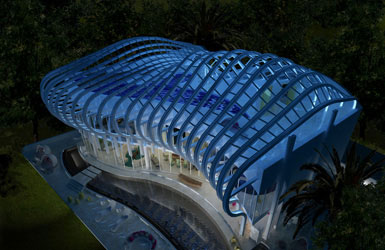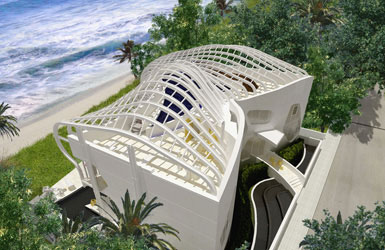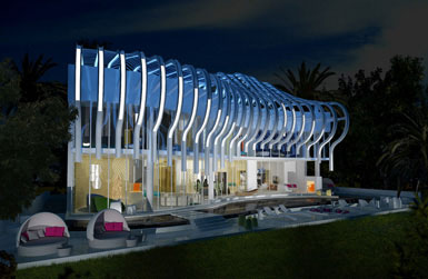 ![]() ![]() ![]() ![]() Mobius設計集團在塞浦路斯南海岸的拉納卡(Larnaca)設計了一座私人豪華別墅,坐落在水岸邊一個1525平方米的地塊上。建筑師Andreas Trisveis特意跑到香港來尋找設計理念。 這座未來派的別墅有912平方米,很像是日本藝術家Κatsushika Hokusai的畫“巨浪”。別墅非同尋常的雕塑般外形就如同附近拍打的浪花。 不銹鋼和玻璃建造的屋頂頂棚會根據外部溫度自動打開。建成后整座住房都會利用高科技系統來自動操作。屋頂還有一座花園,設置了酒吧、浴缸和瑜伽平臺。 內部空間采用了1960年代邁阿密的風格,地下是溫泉區,底層則是餐廳、起居室、娛樂室以及辦公室、臺球室和專門儲藏雪茄的房間等。別墅設有四間臥室和一座高級套房,還有專為客人準備的起居室。 面朝大海建造了一座大型的泳池,別墅彎曲的線條融合在了天際線中,頗有些Gustave Flaubert筆下所寫的,海面平滑,水平線上的浪花緩緩向天際涌動。