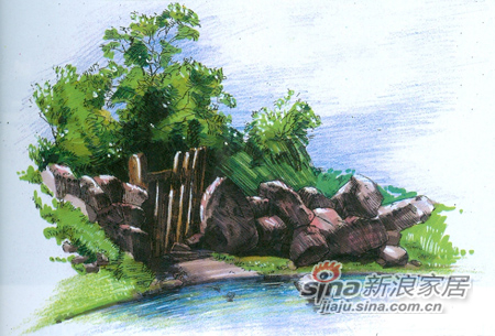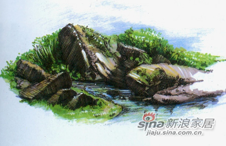 節約型自然風格 快節奏的都是生活使人們渴望回歸自然的心理日趨迫切。自然清新的設計就好像把對象輕輕放在大自然之中,所有的疲憊和倦怠隨之煙消云散。自然主義風格意味著取材及加工原始,節約,以不失自然風貌為準,源于自然,融于自然,如駁岸設計,摒棄工業裝飾元素,體現了對現代工業的反叛和返璞歸真的愿望。用不加雕琢的石頭堆砌了駁岸,既能防止溪水沖刷而造成的水土流失,又不破壞原有的生態環境。石塊肌理斑駁,小草叢生于石縫中,整個景觀就像土里長出來的一樣自然。