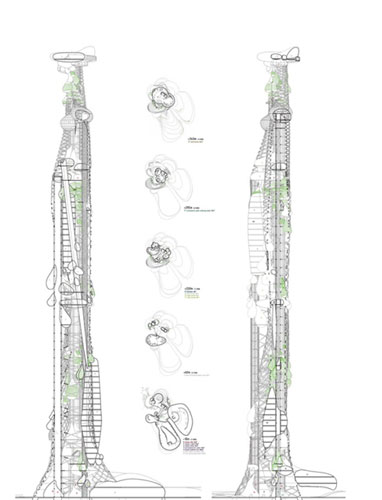 之前我們介紹了臺(tái)灣設(shè)計(jì)概念國(guó)際大賽的一等獎(jiǎng)和其他獎(jiǎng)項(xiàng),現(xiàn)在給大家?guī)?lái)的是二等獎(jiǎng)作品“水滴塔”,由Peter Cook男爵和Cook Robotham Architecture建筑事務(wù)所設(shè)計(jì)。 整個(gè)塔的設(shè)計(jì)靈感來(lái)自于能量創(chuàng)造,水滴是整個(gè)設(shè)計(jì)的基本元素。塔的主要目的是生產(chǎn)水藻,水藻能做為魚(yú)的食物,能作為造紙的原料,也能作為生物燃料。整座塔可提供10888平米的水藻面,這每年能生產(chǎn)出相當(dāng)于3266400升的石油。 一系列的鋼架結(jié)構(gòu)圍繞著電梯井的鋼鐵核心向上盤(pán)旋。立面上的“水滴”則是覆有植物薄膜的鋼籠。 一共有三層觀(guān)察層: 頂層觀(guān)察層,可俯瞰遠(yuǎn)處山丘; 中間觀(guān)察層,包括水生植物生長(zhǎng)區(qū),可讓公眾看到植物的生長(zhǎng); 低層觀(guān)察層,包括鳥(niǎo)舍和魚(yú)池。 建筑內(nèi)還包括三個(gè)辦公區(qū),供市發(fā)展局使用。博物館位于塔基五層。塔的中間層是展覽區(qū)。 ![]() ![]() ![]() ![]()