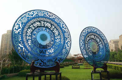 一對青花瓷盤奧運景觀花壇在長安街復興門處亮相,以其清新典雅的“巨姿”點綴京城美色。