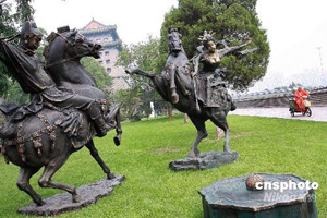 8月28日,女雕塑家黃劍獻給2008年北京奧運會的大型群雕《明皇貴妃馬球圖》在北京明城墻遺址公園展出,不少游客前來參觀拍攝。貴妃馬球雕塑作品是奧林匹克公園內唯一一組與環境景觀同時設計的永久性雕塑,也是一組在中國公共藝術作品中罕見的描述古代體育運動的大型雕塑作品。