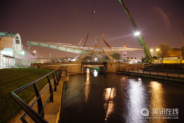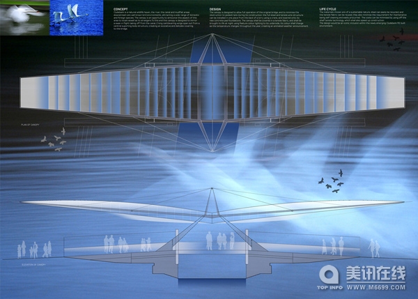 憑借作品Forth & Clyde Canal人行橋上的天鵝形遮篷,英國(guó)頂級(jí)結(jié)構(gòu)工程公司布羅•哈波爾德(Buro Happold)贏得了一枚Saltire Award土木工程獎(jiǎng)。 這個(gè)天蓬的委托者是蘇格蘭克萊德班克鎮(zhèn)城市復(fù)興開(kāi)發(fā)公司Clydebank Re-built。布羅•哈波爾德公司攜手RMJM建筑事務(wù)所共同為該項(xiàng)目進(jìn)行了規(guī)劃設(shè)計(jì)。天蓬的設(shè)計(jì)靈感源自一只飛行中的姿態(tài)優(yōu)雅的天鵝,它橫跨了克萊德班克鎮(zhèn)中心的Forth and Clyde Canal人行橋,為這個(gè)小鎮(zhèn)帶來(lái)了新氣息。 這個(gè)天蓬的跨度超過(guò)了40米,中心支柱任意兩端的懸臂達(dá)20米。這是一個(gè)帶有自潔式功能的建筑物,它身著了一層可重復(fù)利用的PTFE涂層玻璃“外衣”,它的“胳膊”向外伸展做出了一系列拱形動(dòng)作,從而形成了天鵝修長(zhǎng)輕盈的翅膀。延伸到人行橋任意一端的四條鋼制腿部上冒出來(lái)的鋼鐵手臂將兩只天鵝翅膀緊緊地固定住,給予了穩(wěn)定的撐力。 “在這項(xiàng)設(shè)計(jì)里,我們所面臨的一個(gè)重要挑戰(zhàn)就是天鵝形遮篷遭遇到大型風(fēng)力的提升,”布羅•哈波爾德公司Ian Hargreaves表示,“通過(guò)采用電纜、懸掛桅桿,我們將重力荷載和向下風(fēng)力進(jìn)行了良好地防御控制,此外,將手臂和翅膀分離以形成一個(gè)三角孔桁梁也防止了風(fēng)力提升!