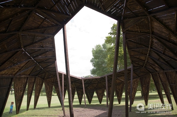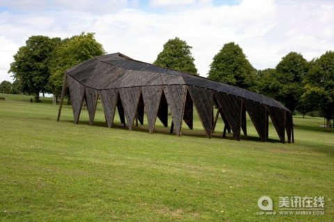 ![]() ![]() 7月25日,星期六,藝術家Heather & Ivan Morison夫婦帶領一支志愿小隊在英國布里斯托爾市的維多利亞公園里建造一個臨時公共藝術品,他們從黎明一直工作到黃昏。他們設計的這個藝術品叫作“烏云”,一個像亭子一樣的木質結構。Heather & Ivan Morison夫婦是受到西英格蘭大學Situations的委托來進行此次設計的,建筑學畢業生Sash Reading進行了協助。這個藝術品將在接下來四個多月內,作為公園內活動表演的聚會點和舞臺使用。 “烏云”名字來自于Fred Hoyle爵士的小說,小說中的烏云是一片大面積的黑色氣體,能阻止太陽輻射到達地球,但是最終發現烏云實際上一個有感知能力的超有機體。 設計參照了委內瑞拉的Shabono——中間是露天社區,周圍的生活區上則建設了一些有遮蓋的建筑。“烏云”提取了這些抽象元素,然后再用一種新的形式表現出來。新的形式就是三角木板結構,在公園的燈光的照射下,顯得非常有活力。“烏云”上方有一個網狀穹頂。“烏云”由152個獨特的三角板組成,看起來就像是一個活生生的巨大昆蟲。建筑木料來自于Heather & Ivan Morison夫婦在威爾士的林園,使用日本焦化技術進行處理,最終成為了這種黑色的保護屏。 “烏云”的建造還反映出了芬蘭的習俗:“一起工作”和“倉庫建造”。“一起工作”是指大群的人們聚集在一起無償地進行工作。“倉庫建造”是指社區的人們聚集在一起建造為一戶人家或者多戶人家建造倉庫。 “烏云”將會供公園游客、當地居民、社團和組織使用。“烏云”也是公園公共藝術品設計的先驅建筑。 “烏云”的使用期限到09年12月6日。