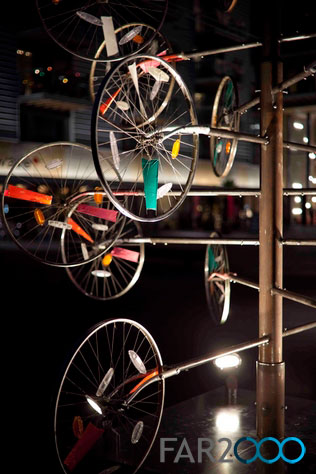 據報道,開發商Igloo授權倫敦的可持續建筑設計公司Sarah Wigglesworth在倫敦一座公共廣場建造“永不凋零的圣誕樹”。 這株圣誕樹是用回收的自行車部件組裝的,包括35輛自行車的輪胎,組合在一個簡單的結構上。這些輪胎是從英國慈善機構“Re~Cycle”那里租用的。這個組織專門回收自行車,并把部件送到非洲。“圣誕樹上的小彩燈”是用反射光裝置制作的。 圣誕樹的設計為將來自行車部件的存儲和組裝提供了一種思路,而且這株圣誕節在每年都可以拿出來再用。 Hatton Metalcraft公司用一周時間建造了這株圣誕樹,安裝在Bermondsey廣場只花了數小時。 輪胎能夠在可再生能源的帶動下移動。原本設想人們通過踏板把電量通過鏈條傳送到輪胎上,后來發現風力發電更簡單,速度更快。因此,每一個輪胎都成了一座小小的風力渦輪,連接在每個分支的尾部。 圣誕樹的建造與廣場的建筑是對應的。每一套公寓都采用熱交換系統和一個制冷系統,外部空氣經過加濕后來冷卻循環的空氣,這種自然通風能夠減少60%的碳排放和50%的運行成本。