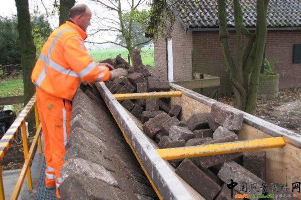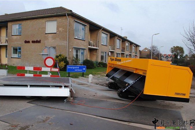 在一個傾斜的平面上,工人將用于鋪路的磚塊放進去,通過電動履帶的慢慢帶動,由于重力的影響另外一頭就能輸出排列整齊的磚塊道路,并且自動鋪設到路面上,每天每輛Tiger-Stone可以鋪設近400米的道路,令人稱奇的是它還能夠調整6米之內的輸出范圍。