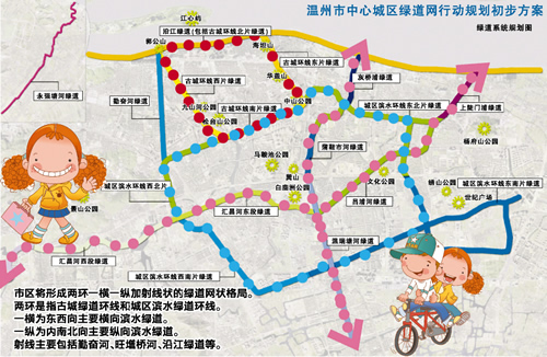 綠道,顧名思義是一種線形的綠色開敞空間,通常沿著河濱、溪谷、山脊、風景道路等自然和人工廊道建立,內設可供行人和騎車者游憩的景觀線路。根據《溫州市中心城區綠道網規劃初步方案》,城區綠網總長約45.75公里,用地面積約257.12公頃,包括濱水型、依山型、都市型的綠道,以“兩環一橫一縱加射線”的布局結構呈現。