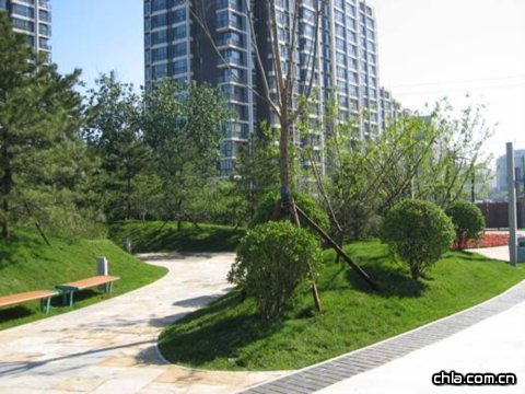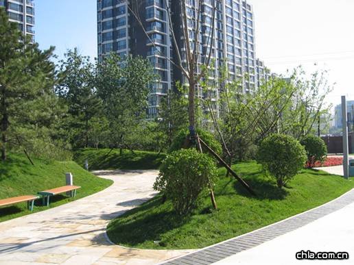 實(shí)景2、3   該園以自然形式植物培植為主,強(qiáng)調(diào)健身與景觀。圖為主入口處,其綠地內(nèi)地形以"綠島"形式星羅密布,錯(cuò)落有致,山脊線要曲,地形有急有緩。鋪裝、小品、種植的植物有機(jī)銜接。"綠島"中多以大規(guī)格的國(guó)槐、洋槐點(diǎn)綴其中,與大黃葉球相得宜彰。