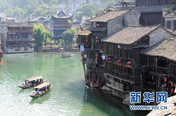 游客在湘西鳳凰沱江上泛舟欣賞沿岸的特色民居  龍弘濤 攝
